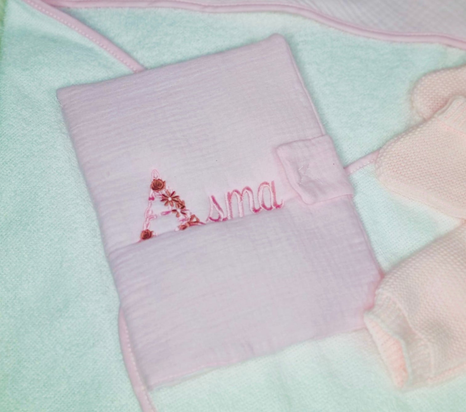 Chaque protège carnet peut être personnalisé avec le prénom de votre enfant, subtilement brodé avec une première lettre fleurie, pour créer un souvenir unique et intemporel à chérir pendant des années.